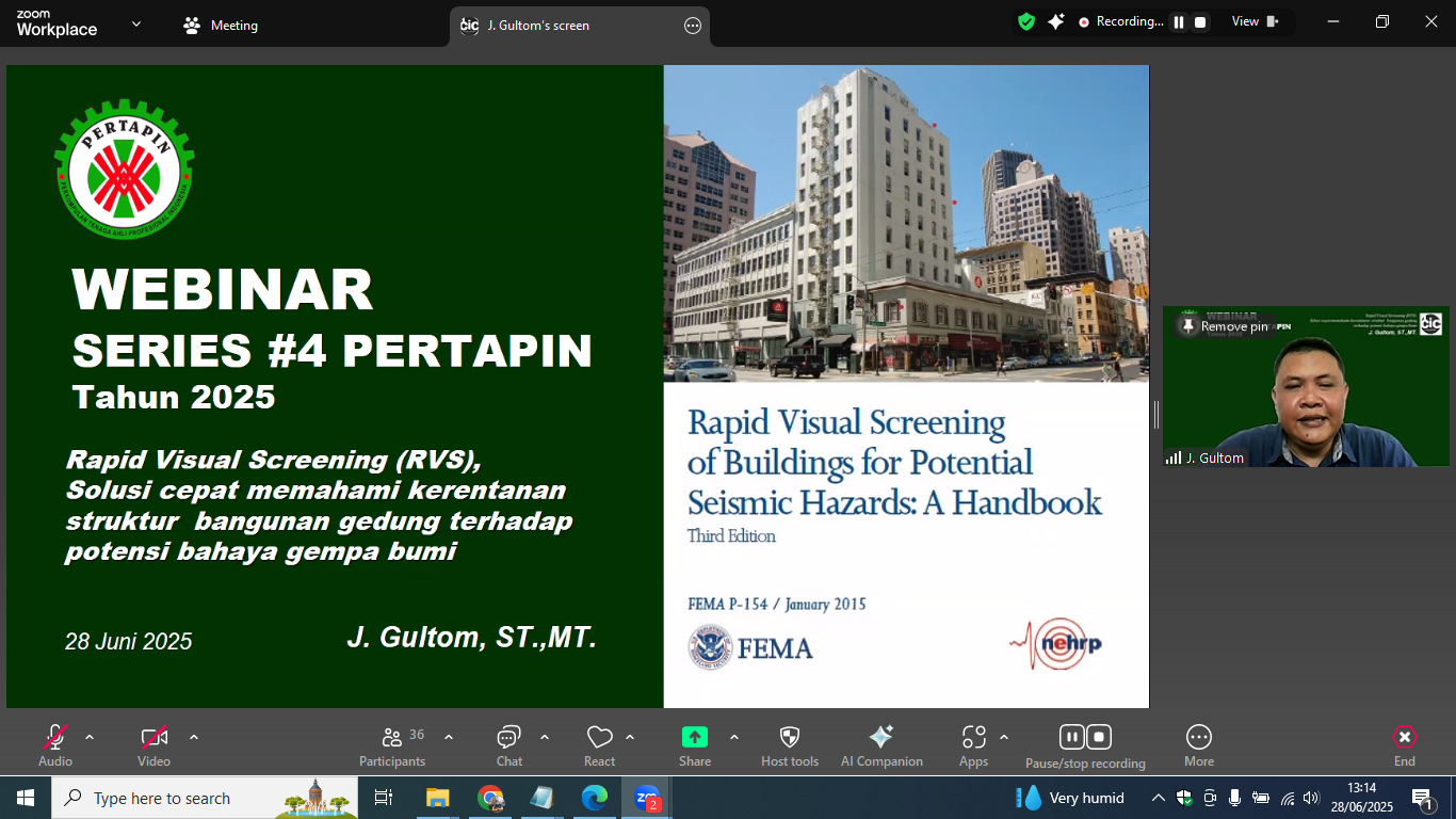 Jakarta, 29 Agustus 2025. PERTAPIN selenggarakan Webinar Series #4 PERTAPIN Tahun 2024 dengan mengangkat tema “Rapid Visual Screening, Solusi Cepat Memahami Kerentanan Struktur Bangunan Gedung terhadap Potensi Bahaya Gempa Bumi”. Kegiatan yang dilaksanakan pada tanggal 28 Juni 2025 ini diikuti oleh 58 peserta yang bergabung secara daring melalui virtual zoom meeting, baik dari unsur anggota PERTAPIN maupun umum. Hadir sebagai Narasumber yaitu Bapak Junpieter Gultom, S.T., M.T. yang merupakan Konsultan Teknik Sipil dan dimoderatori oleh Ibu Ir. Lilis Indriani, S.T., M.T., IPM. selaku Asesor Kompetensi LSP Konstruksi Pertapin Raya. Kegiatan yang dilaksanakan dengan 2 sesi ini terdiri dari sesi penyampaian materi dan sesi tanya jawab yang dimulai dari pukul 13:00 WIB dan berakhir pada pukul 15:00 WIB.