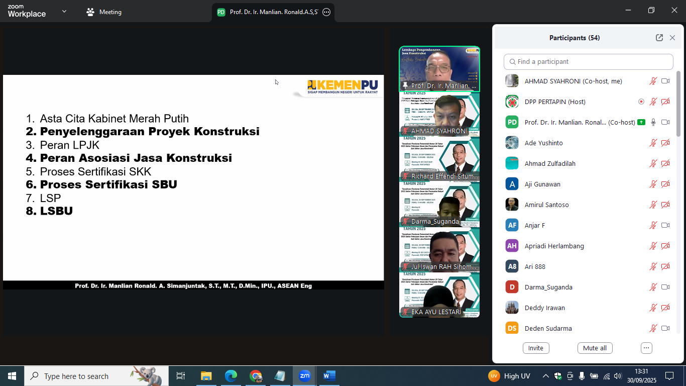 Jakarta, 03 Oktober 2025. PERTAPIN yang bekerjasama dengan PERKOPINDO menyelenggarakan Webinar Series #6 PERTAPIN Tahun 2025 dengan mengangkat tema “Sosialisasi Peraturan Pemerintah Nomor 28 Tahun 2025 Sektor Pekerjaan Umum dan Perumahan Rakyat Sub Sektor Jasa Konstruksi”. Kegiatan yang dilaksanakan pada tanggal 30 September 2025 ini diikuti oleh 59 peserta yang bergabung secara daring melalui virtual zoom meeting, baik dari unsur anggota PERTAPIN dan PERKOPINDO maupun umum. Hadir sebagai Narasumber kegiatan, yaitu Bapak Prof. Dr. Manlian Ronald A. Simanjuntak, S.T., M.T., D.Min, IPU., ASEAN Eng. yang merupakan Pengurus LPJK Kementerian Pekerjaan Umum – Koordinator Bidang V, dan dimoderatori oleh Bapak Ahmad Syahroni selaku Pengurus DPP PERKOPINDO. Kegiatan yang dilaksanakan dengan 2 sesi ini terdiri dari sesi penyampaian materi dan sesi tanya jawab yang dimulai dari pukul 13:00 WIB sampai selesai.